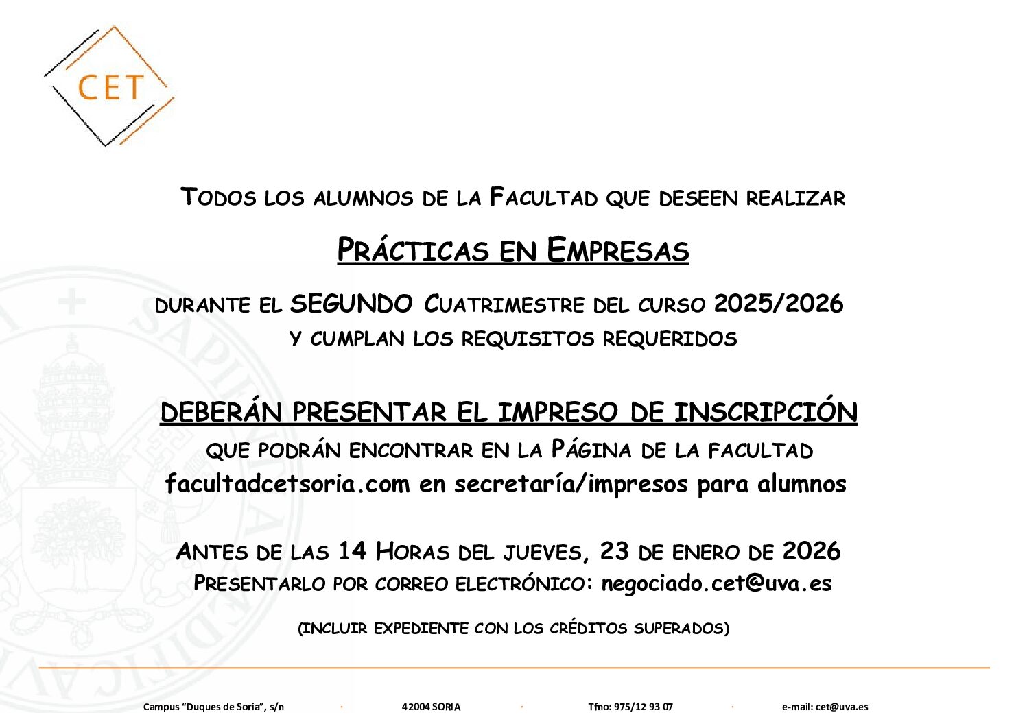 Se convoca a los alumnos de la Facultad, que cumplan los requisitos establecidos, para que soliciten la realización de Prácticas en Empresas durante el Segundo Cuatrimestre de este curso 2025/2026.